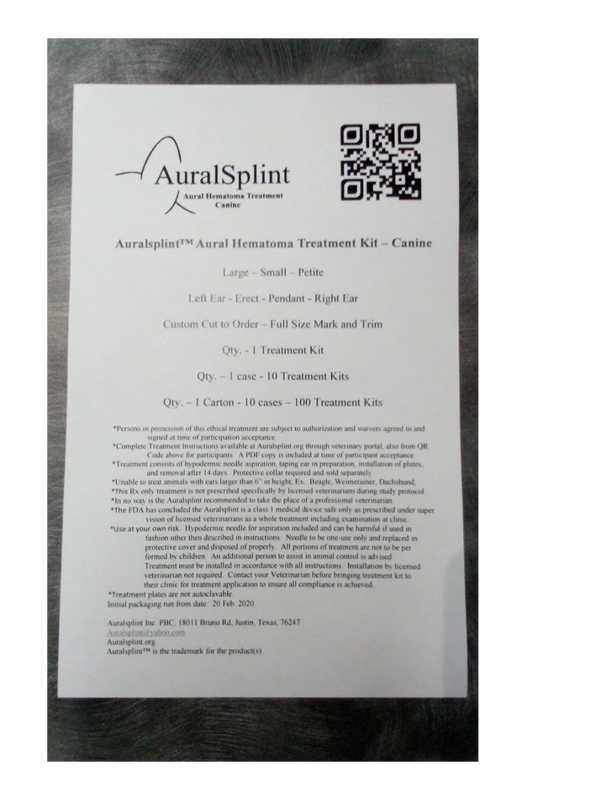 I will return to you confirmation of receipt of order, and any questions I may have to complete your order. A complete set of Treatment Instructions (PDF) will accompany my reply. Only the name of animal and case number will be used in all reporting. All personal information is kept private and will not be shared. The survey form (sent by email after treatment conclusion) is to be filled out and returned to Auralsplint@yahoo.com for inclusion in your case file and in the subsequent studies.